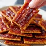 Keeping an eye on the crackers in the last few minutes of baking and rotating your baking sheet halfway through helps. Also, don’t go over the recommended baking time — 15 to 20 minutes at 350°F is usually perfect to get crispy, caramelized bacon without burning the sugar.