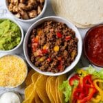 Keywords: taco charcuterie board, taco night, party appetizer, ground beef tacos, Mexican platter, build your own taco