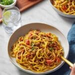 Keywords: taco spaghetti, taco pasta, ground beef pasta, easy weeknight dinner, Tex-Mex pasta