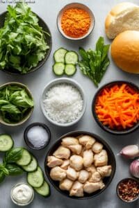 Each ingredient in this Thai Fried Chicken Sandwich Recipe is chosen to balance richness, spice, freshness, and crunch. When shopping, I recommend fresh herbs and good quality chicken thighs for maximum flavor, and if you can find Thai basil, grab it—it really elevates the whole sandwich.