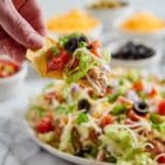 Freezing isn’t ideal for this dip because the fresh layers like lettuce and tomatoes don’t hold up well. However, the seasoned bean layer can be frozen separately if you want to prep in stages.