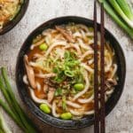 This warming Udon Noodle Soup with Miso Broth is a comforting Japanese-inspired dish featuring tender udon noodles, shiitake mushrooms, napa cabbage, and edamame in a flavorful miso and soy-based broth with a touch of heat from sriracha and the nuttiness of toasted sesame oil.